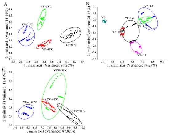 Principal component analysis plots of electronic nose data ((A) dry YPs at different temperatures, (B) different water ratios of YPs, (C) YP emulsion at different temperatures).
