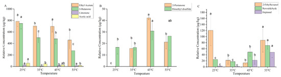 Changes in the concentrations of volatile compounds in dry YPs at different heating temperatures ((A) changes in the concentrations of ethyl acetate, 2-butanone, limonene, and acetic acid in dry YPs at different heating temperatures; (B) changes in the concentrations of 2-pentanone and dimethyl disulfide in dry YPs at different heating temperatures; (C) changes in the concentrations of 3-methyl-2-butanone, 2-ethylhexanol, benzaldehyde, and heptanal in dry YPs at different heating temperatures). Letters (a, b, c) indicate significantly difference at p < 0.05 (Duncan test).