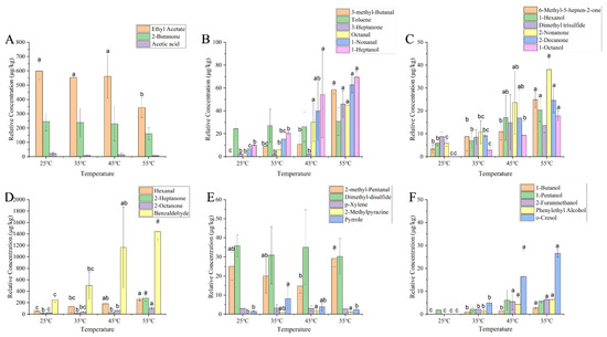 Changes in the concentrations of volatile compounds in aqueous YPs at different heating temperatures ((A) changes in the concentrations of ethyl acetate, 2-butanone, and acetic acid in aqueous YPs at different heating temperatures; (B) changes in the concentrations of 3-methyl-butanal, toluene, 3-heptanone, octanal, 1-nonanal, and 1-heptanol in aqueous YPs at different heating temperatures; (C) changes in the concentrations of 6-methyl-5-hepten-2-one, 1-hexanol, dimethyl trisulfide, 2-nonanone, 2-decanone, and 1-octanol in aqueous YPs at different heating temperatures; (D) changes in the concentrations of hexanal, 2-heptanone, 2-octanone, and benzaldehyde in aqueous YPs at different heating temperatures; (E) changes in the concentrations of 2-methyl-pentanal, dimethyl disulfide, p-xylene, 2-methylpyrazine, and pyrrole in aqueous YPs at different heating temperatures; (F) changes in the concentrations of 1-butanol, 1-pentanol, 2-furanmethanol, phenylethyl alcohol, and o-cresol in aqueous YPs at different heating temperatures). Letters (a, b, c) indicate significantly difference at p < 0.05 (Duncan test).