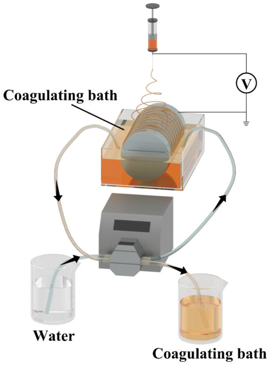 The electrospinning solution was added to a 10 mL syringe and the syringe was secured onto the syringe pump of the electrospinning machine. The parameters of the electrospinning machine were set as follows: solution flow rate at 0.08 mL/min, collection distance at 5–10 cm, collector roller speed at 2 rpm/min, temperature inside the electrospinning machine at 40 °C, and electrospinning voltage at 20–28 kV. During the electrospinning process, the lower half of the collecting roller was immersed in the coagulation bath. After electrospinning, the electrospun fibers were air-dried at room temperature for 48 h.