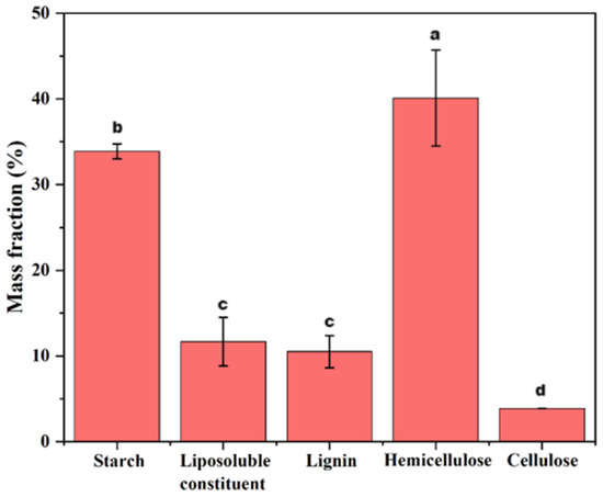 The content of various biomass components in ginger residues was roughly measured using an extraction method [25]. Ginger residues obtained by drying and grinding the residues left after juicing ginger were subjected to a process. Deionized water was added to the ginger residue powder at a material-to-water ratio of 1:30, stirred at 80 °C for 60 min, and this process was repeated three times. The mixture was then dried at 55–60 °C. The reduced mass was approximately the mass of water-soluble starch. The residue was degreased with petroleum ether and acetone. The degreased samples were treated with a sodium hypochlorite solution (50 g/L, pH = 4.0) at 70 °C for 2 h. The residue was washed and dried to obtain delignified ginger residues. The delignified ginger residues were treated with 10% potassium hydroxide at 55 °C for 12 h, filtered, and dried to remove hemicellulose. The resulting samples, after each step, were weighed to calculate the approximate content of each biomass component in the ginger residues.