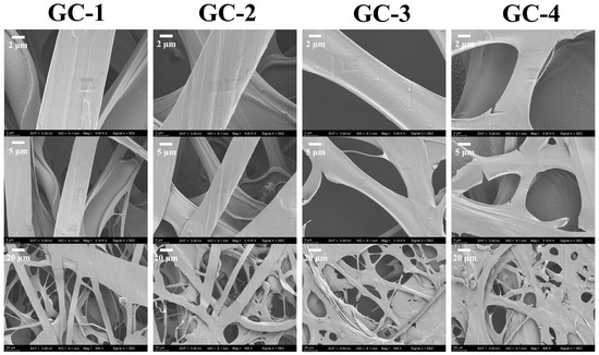 The SEM images of electrospun fibers from ginger waste/cellulose powder are shown in Figure 3. The plasticization process of fibers involved the continuous transfer of the ionic liquid to the coagulation bath, which might result in an uneven surface of the fibers [27]. Additionally, due to the complex polymer composition in ginger waste powder, a homogeneous electrospinning solution could not be formed. As a result, the fibers formed are not uniform in diameter. Due to the excellent spinnability of GC-1 and GC-2 solutions, a clearer fiber structure was eventually formed. As the spinnability of the electrospinning solution decreases, the GC-4 solution formed fibers with film inserts.