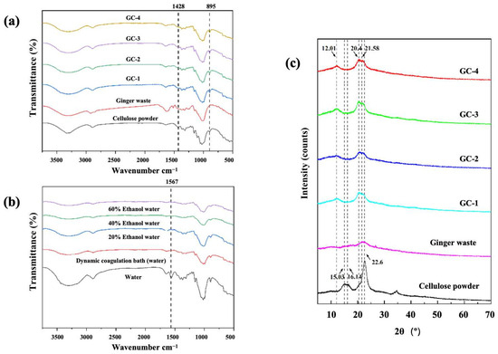 By recording the attenuated total reflectance–Fourier transform–infrared (FTIR) spectra (Spectrum Two, Perkin Elmer, Waltham, MA, USA) in the range of 4000~500 cm−1, potential chemical changes in cellulose and ginger waste were observed. In addition, the residue of [Bmim]Ac in ginger waste/cellulose powder fibers can also be screened in the FTIR spectra, verifying the effectiveness of the coagulation bath in elution.