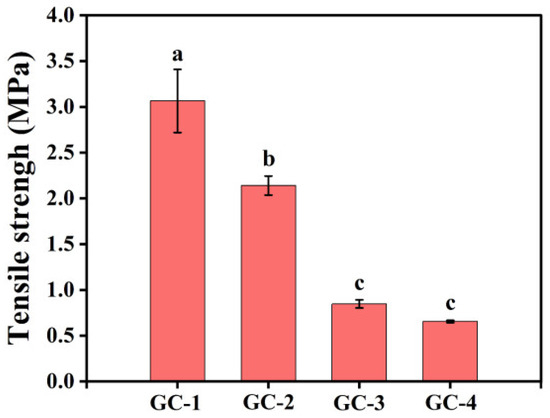 The tensile strengths of the GC-1, GC-2, GC-3, and GC-4 fibers are shown in Figure 5. The tensile strengths of the GC-1, GC-2, GC-3, and GC-4 fibers decreased sequentially, which may be related to the structure of the fibers. During the electrospinning process, the jets of GC-1 and GC-2 solutions were relatively stable, forming electrospun fibers with a clear structure and tight connections. As the spinnability of the electrospinning solution decreases, fibers with film inserts were formed. The connections between fibers with film inserts were weaker, leading to a decrease in the tensile strength of the fibers.