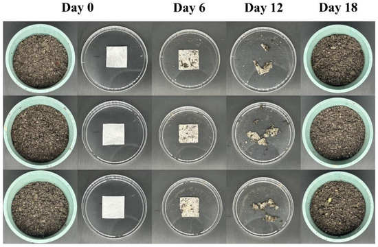 The main biomass components of GC-1 and 6-Shogaol-GC-1 ginger waste residue/cellulose electrospinning fiber membranes are the same. Therefore, the soil degradation experiment of GC-1 ginger waste residue/cellulose electrospinning fiber membranes was conducted to confirm the biodegradability of GC-1 and 6-Shogaol-GC-1 ginger waste residue/cellulose electrospinning fiber membranes. The experimental results of soil degradation of GC-1 ginger waste residue/cellulose electrospun fiber film are shown in Figure 8. The results of three parallel experiments showed that, on the 6th day of the experiment, the change of GC-1 ginger waste residue/cellulose electrospinning fiber membrane was not obvious; on the 12th day of the experiment, GC-1 ginger waste residue/cellulose electrospinning fiber membrane was partially degraded; on the 18th day of the experiment, there was no obvious GC-1 ginger waste residue/cellulose electrospinning fiber fragments in the horticultural soil, so it was considered that GC-1 ginger waste residue/cellulose electrospinning fiber was completely degraded. The soil degradation experiment confirmed the biodegradability of GC-1 and 6-Shogaol-GC-1 ginger waste residue/cellulose electrospinning fiber membranes.