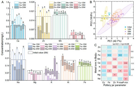 The variations in metal ion concentrations in Baijiu aged for 0, 12, 16, and 20 months in six types of pottery jars. (A) Metal ion concentrations in the Baijiu. (B) PCA of metal ion concentration in Baijiu. (C) Analysis of the partial correlation between pottery jar parameters and metal ions in the Baijiu. + p ≤ 0.1 and ++ p ≤ 0.05. Red indicates a positive correlation; blue indicates a negative correlation.