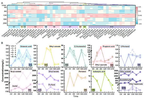 Cluster heatmap and representative parameter changes of the 48 selected flavor substances in Maotai-flavored Baijiu. (A) Cluster heatmap, where different colors represent 10 different categories (i.e., 10 flavor groups); (B) Changes in the content of 15 representative flavor substances from the 10 flavor groups, where G1, G2… represent group 1 and group 2, and so on.