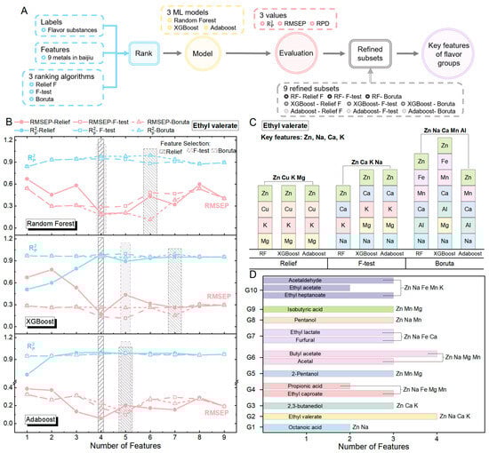 Figure 3B shows the Rp2 and RMSEP values of the three ML models using the feature subset to predict ethyl valerate (G2). The AdaBoost model more accurately predicted the concentration of ethyl valerate than the RF and XGBoost models. The Rp2 value shows a trend of first increasing and then decreasing, while RMSEP shows the opposite trend, which is consistent with the fundamental theory of feature selection. Overall, prediction models built with too few features can lead to a decrease in prediction accuracy, while too many features can introduce noise that interferes with the prediction. Specifically, the feature subsets obtained by the Relief F ranking algorithm were input into the RF, XGBoost, and AdaBoost models, respectively. When the feature subset containing four features was used to predict the content of ethyl valerate, the Rp2 and RMSEP values of the three models reached their optimum, with Rp2 values of 0.978, 0.947, and 0.998, and RMSEP values of 0.199, 0.283, and 0.056, respectively. Therefore, the three refined subsets obtained all contain four features. The common features among them are Zn, Cu, K, and Mg, which are identified as the key features of this group. Similarly, for the feature subset obtained using the F-test and Boruta ranking algorithms, the corresponding refined subset is obtained by comparing the Rp2 and RMSEP values of the model using this subset. Ultimately, two sets of key features were identified: Zn, Ca, K, Na and Zn, Na, Ca, Mn, Al. Select the features that appear twice or more from the three sets of key features as the final key features, which are Zn, Na, Ca, and K. These features significantly influence the formation of pentyl acetate, as shown in Figure 3B,C. In addition, when a flavor group contains several representative flavor substances (such as G5, G7, and G10), the results of their screening should be combined. The results of the feature screening for the flavor group are illustrated in Figure 3D.