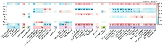 Correlation between key metal ions and flavor substances based on feature selection (* p ≤ 0.05 and ** p ≤ 0.01; red indicates a positive correlation, blue indicates a negative correlation).