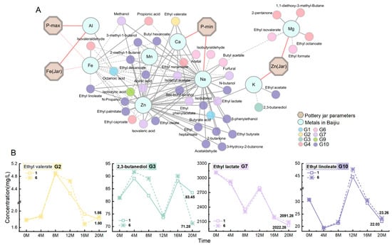 By combining the above analysis results (Section 3.2.2) with the partial correlation analysis results of the pottery jar parameters and metal ions (Section 3.1), a correlation network diagram, as shown in Figure 5A, was created. According to the figure, Fe and P-max in the pottery jar were significantly negatively correlated with the content of Fe in the Baijiu, P-min was significantly positively correlated with Na and Ca in the Baijiu, while Zn in the pottery jar was positively correlated with Mg and K in the Baijiu. Furthermore, Na was significantly positively correlated with flavor substances in the G2, G7, and G10 flavor groups, and Ca was significantly positively correlated with flavor substances in the G2 and G7 flavor groups. On the other hand, Fe was significantly negatively correlated with flavor substances in the G7 and G10 flavor groups, while K was significantly negatively correlated with the flavor substances in the G3 flavor group. These results indicate that the increase in Fe content, P-max, and P-min in the pottery jar collectively promotes the formation of flavor substances in G2, G7, and G10 flavor groups, while the increase in Zn content in the pottery jar inhibits the formation of flavor substances in G3 flavor group.