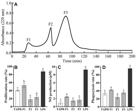 Elution curve of the peptide fractions obtained after the separation of trypsin hydrolysates of the T. albacares dark muscles using gel filtration and their effects on the immunomodulatory activity of RAW 264.7 cells. (A) Chromatogram profiles of TAPHs by Sephadex G-25 gel filtration and detection at 220 nm. The effects of gel filtration fractions on proliferation rate (B), NO production (C), and phagocytosis rate (D) in RAW 264.7 cells. The data are presented as means ± SD. Different lower-case letters indicate significant differences (p < 0.05) among the groups.