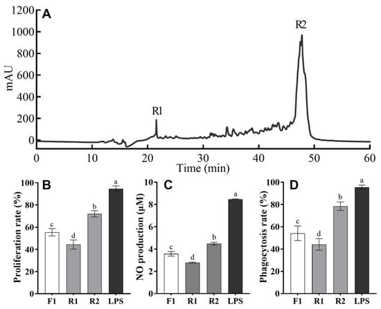 Elution curve of the fraction F1 separated in RP-HPLC and the effects of the R1 and R2 fractions on the immunomodulatory activity of RAW 264.7 cells. (A) Chromatogram profiles of TAPH by RP-HPLC and detection at 220 nm. The effects of HPLC fractions on proliferation rate (B), NO production (C), and phagocytosis rate (D) of RAW 264.7 cells. The data are presented as means ± SD. Different lower-case letters indicate significant differences (p < 0.05) among the groups.