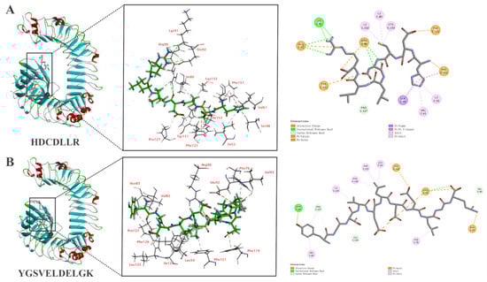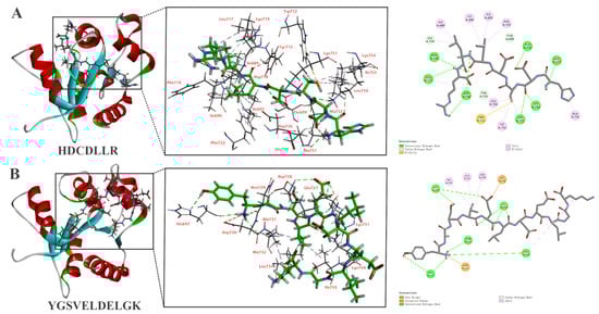 The molecular interaction of (A) HDCDLLR and (B) YGSVELDELGK binding to TLR4/MD2. The 3D reconstruction offers a panoramic view of the post-docking complex (left) and details the specific residues interacting with the peptide (middle), and the 2D representation highlights the site of peptide interaction with the TLR4/MD2 receptor (right).