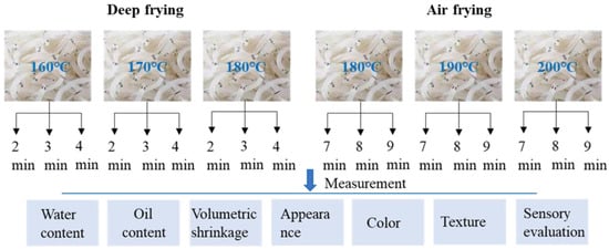 Therefore, this study aimed to (1) investigate the influence of frying conditions on mass transfer, volumetric shrinkage, appearance, color, textural properties, and lipid oxidation under deep frying and air frying; and (2) establish correlations between quality attributes and analyze the underlying causes of quality changes.