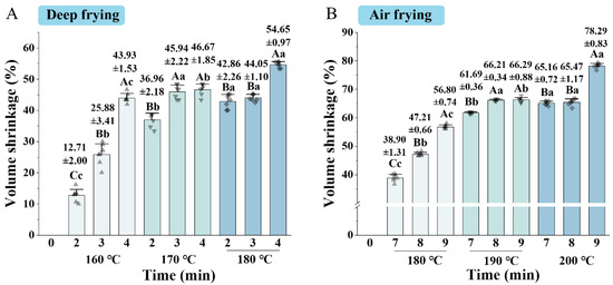 Effect of frying conditions on the volumetric shrinkage of clearhead icefish (Protosalanx hyalocranius) fried under different frying methods. (A) volume shrinkage of deep-fried samples; (B) volume shrinkage of air-fried samples. Different uppercase letters (A–C) indicate significant differences within different time (p < 0.05), and different lower-case letters (a–c) indicate significant differences within different temperature (p < 0.05).