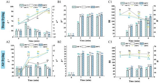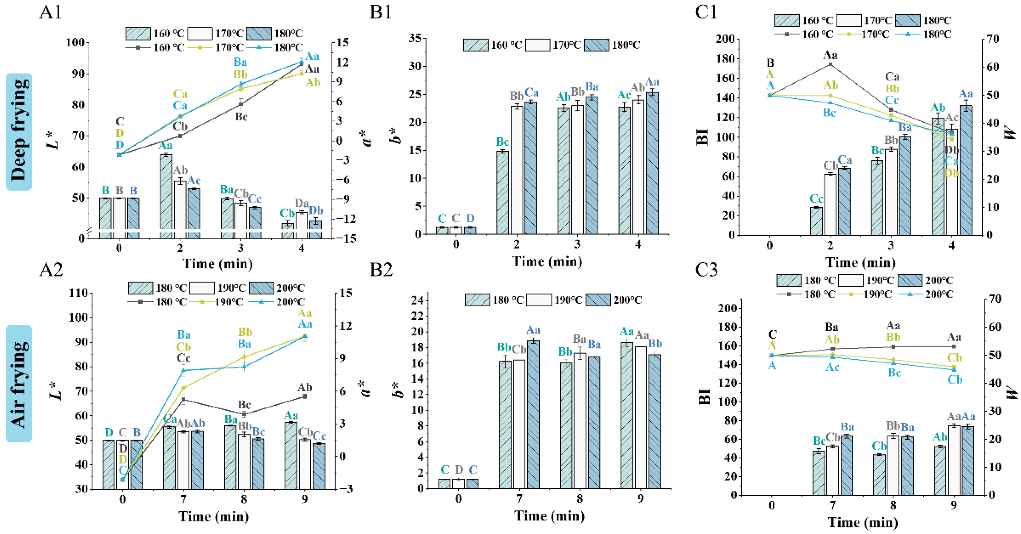 Effect of frying conditions on the color properties of clearhead icefish (Protosalanx hyalocranius) fried under different frying methods. (A1): L* and a* of deep-fried samples; (B1): b* of deep-fried samples; (C1): BI and W of deep-fried samples. (A2): L* and a* of air-fried samples; (B2): b* of air-fried samples; (C2): BI and W of air-fried samples. Different uppercase letters (A–D) indicate significant differences within different time (p < 0.05), and different lower-case letters (a–c) indicate significant differences within different temperature (p < 0.05).