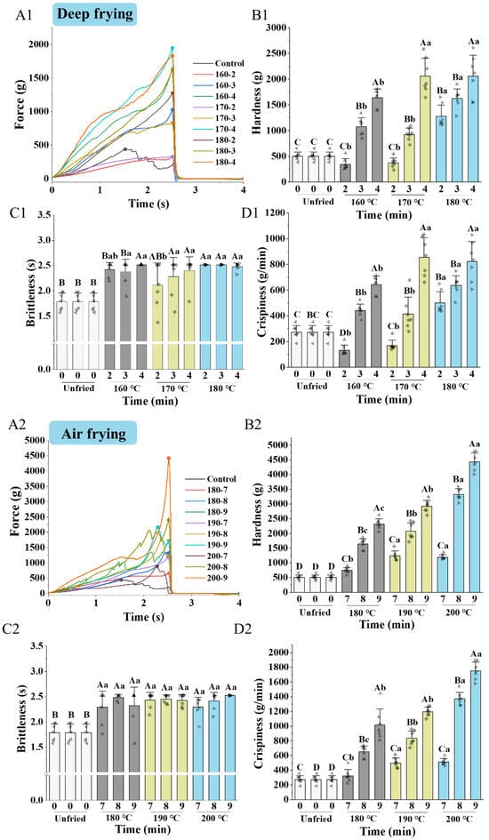 Effect of frying conditions on the textural properties of clearhead icefish (Protosalanx hyalocranius) fried under different frying methods. (A1–D1): time-force curves, hardness, brittleness, crispiness of deep-fried samples, respectively; (A2–D2): time-force curves, hardness, brittleness, crispiness of air-fried samples, respectively. Different uppercase letters (A–D) indicate significant differences within different times (p < 0.05), and different lower-case letters (a–c) indicate significant differences within different temperatures (p < 0.05).
