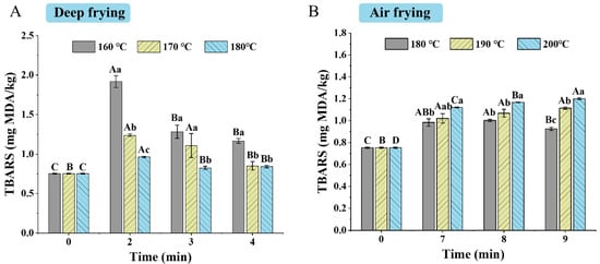 Effect of frying conditions on the TBARS values of clearhead icefish (Protosalanx hy-alocranius) fried under different frying methods. (A): TBARS of deep-fried samples; (B): TBARS of air-fried samples. Different uppercase letters (A–D) indicate significant differences within different time (p < 0.05), and different lower-case letters (a–c) indicate significant differences within different temperature (p < 0.05).