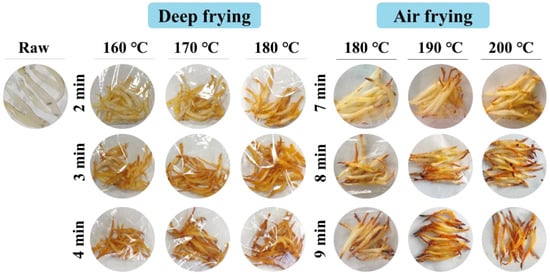 The changes in appearance can be scientifically analyzed by the results of sensory evaluation (Table 3). When the deep-frying temperature was 160 °C, the scores for color, texture, flavor, and overall acceptability of the products increased significantly with increasing time (p < 0.05). At deep-frying temperatures of 170 °C and 180 °C, the scores for color, texture, flavor, and overall acceptability increased and then decreased. For the air-frying samples, the sensory scores increased significantly at 180 °C, and the sensory scores increased and then decreased at 190 and 200 °C. These phenomena were attributed to the undesirable color and texture caused by excessive heat and mass transfer and the Maillard reaction.