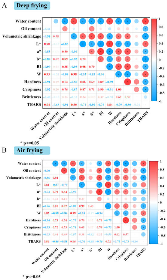 The correlation analysis between the quality attributes of deep-fried and air-fried samples is shown in Figure 7. The water content of deep-fried samples showed a significant positive correlation with L*, W, and TBARS values and a significant negative correlation with volumetric shrinkage, a*, b*, BI, hardness, crispiness, and brittleness (p < 0.05). A similar phenomenon was observed in the correlation of these quality attributes in the air-fried samples. Due to this, the water migration promoted the non-enzymatic browning reaction and the formation of porous structures during frying, leading to increased browning degree and crispiness of the samples [36]. In addition, there was a dry and hard crust on the surface of the sample in the early stage of frying. As the frying proceeded, the internal moisture continued to migrate driven by the difference in the internal and external water vapor pressure, which increased the crust thickness, leading to an increase in the hardness and volumetric shrinkage of the samples [37,38]. The oil content of deep-fried samples was positively correlated with the b* and volumetric shrinkage. The increasing b* values with increasing oil content were related to the color of the frying oil itself. Moreover, the entry of oil acted as a support structure to prevent cell collapse due to water evaporation, thus reducing the volumetric shrinkage [39].