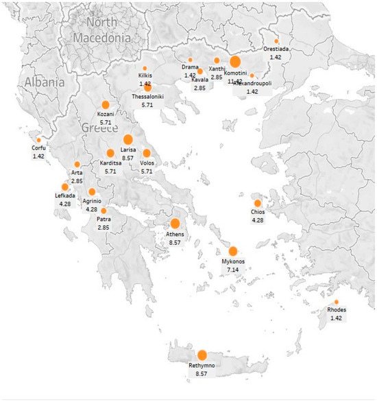 The sample participants presented a diverse range of demographic characteristics, including age, educational attainment and area of residence. In particular, 70 individuals participated in the interviews, of whom 30 were male (43% of the sample) and 40 were female (57% of the sample). The respondents’ age varied between 18 and 72 years with a mean age of 39 years. With regard to their educational level, 47% were university graduates, 27% had completed the basic secondary education and 26% were graduates of a Technical Educational Institute. Furthermore, 77% of the participants resided in the Greek mainland and the remaining 23% in the islands (Figure 2 presents, in detail, the participants’ area of residence). The participants’ monthly average income was EUR 900. Fish was a valuable source of animal protein for the 96% of the sample, followed by beef and chicken (94% of the sample), seafood (93% of the sample), turkey (89% of the sample) and pork (86% of the sample).