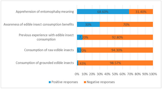 The participants’ acceptance of entomophagy was explored through individuals’ willingness to try/taste edible insects (either raw or incorporated/ground in food items), their motivations towards entomophagy engagement and their perceptions on the prospect of edible insects being distributed through supermarkets and grocery stores, and also being incorporated into the restaurant menus. The main findings showed that a significant proportion of the respondents (approximately 27%) seemed proponents to entomophagy, explaining that they would rather try edible insects in the near future (Figure 5). Furthermore, the share of consumers revealing attitudes in favour of edible insect consumption was even higher in the case of food items with incorporated/ground insects or insect constituents (approximately 41.4%). However, the great majority of the sample respondents seemed convinced that they would never eat edible insects unless during a travel experience or due to specific medical conditions. When the participants were asked if they would be willing to include edible insects in their dietary routine in a future-time perspective, all of the sample participants expressed negative views, mostly annoyance and frustration.