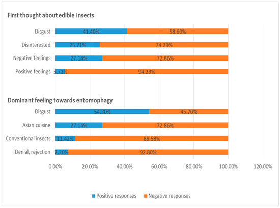 The participants’ perceptions of entomophagy were expressed through a description of their dominant feelings towards edible insect consumption and through sharing the first thoughts on the prospect of “eating bugs”. The main findings are summarized in Figure 4.