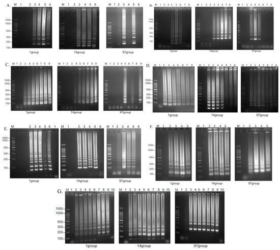Through the NCBI, the highly conserved sequence of the hepatitis A virus-specific shell protein VP1 gene fragment (GenBank: AY334041.1) was identified using the BLAST program (BLASTN). All LAMP primers were designed using the PrimerExplorer V5 online software (http://primerexplorer.jp/lampv5e/index.html (accessed on 7 November 2023)), and we screened out three sets of primers for the hepatitis A virus-specific fragment, named groups 1, 14, and 97 (Table 1). Primer screening was performed under the same amplification conditions and analyzed by AGE.