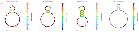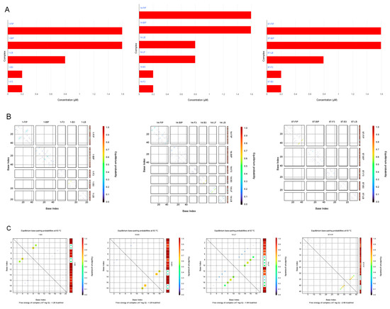 Online access to the NUPACK website (https://www.nupack.org/) [29] was used to simulate the secondary structure formation status of each of the three sets of designed LAMP primers themselves at 63 °C amplification. The results are shown in Figure 2. Figure 2A is the equilibrium concentration diagram, which was used to simulate the steady states of the three groups of primers 1, 14, and 93 after a period of time in the LAMP reaction (there may be stable complementarity between chains, self-complementation, or a chain in the form of a single chain). From Figure 2A, it can be seen that all three sets of primers have no chain-to-chain interaction, and the concentrations of the primers are almost unchanged. This indicates that, during the LAMP reaction, there will be no mismatch between the primers in the system, resulting in a decrease in the primer concentration in the system and affecting the sensitivity of the reaction, and no secondary structure between the primers will be generated. Figure 2B is the overall pairing coefficient diagram of the system chain, and Figure 2C is the pairing probability heat map for a single base pair. Both of them show the base pair position and expected probability of each primer’s secondary structure self-complementation in the LAMP system. The redder the color, the greater the self-complementation probability, and the maximum is 100%. From Figure 2B, it can be seen that 1-FIP, 1-BIP, 1-F3, and 1-LB in primer group 1; 14-FIP, 14-BIP, 14-F3, and 14-LB in primer group 14; and 97-BIP, 97-F3, 97-B3, and 97-LB in primer group 97 did not show the possibility of self-complementation, while 1-B3 and 14-B3 had two matches, and 14-LF and 97-FIP had four matches. From the chain minimum free energy (MFE) visual pattern in Figure 2D, the base pair sites and probabilities of the above four primers’ self-matched secondary structures can be seen. An analysis of the diagram shows that 1-B3 and 14-B3 may have a secondary structure of two base pairs, but the two base pairs themselves are extremely unstable and can easily untie, so they have no major influence on the reaction. Meanwhile, 14-LF and 97-FIP have the possibility of a four-base-pair secondary structure, and the matching is more stable. However, from the heat map analysis, the 14-LF primer’s pairing point shows a light yellow–green color, while the 97-FIP primer’s pairing point shows a light orange color, and their minimum free energy absolute values are less than 3.5 kcal/mol, indicating that the two primers are not likely to be self-complementary. Therefore, the above three groups of primers can be used in experiments in theory, but, based on their actual performance, we selected 14 primers as the optimal primer group to conduct the following experiment.