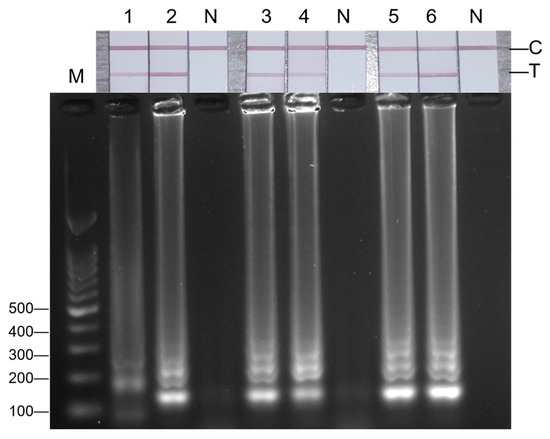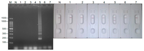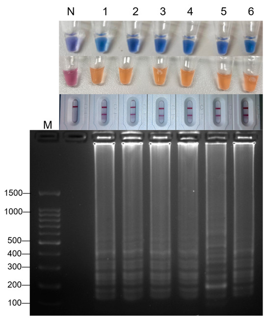 By diluting a series of 2.59 × 105 copies/μL hepatitis A virus RNA standards, 2.59 × 104 copies/μL, 2.59 × 103 copies/μL, 2.59 × 102 copies/μL, 2.59 × 101 copies/μL, and 2.59 × 100 copies/μL were obtained. At each dilution gradient, 1 μL of RNA template was taken for the RT-LAMP sensitivity test. The reaction mixture was incubated at 61 °C for 30 min and terminated at 80 °C for 5 min. The product was detected by a lateral flow test strip and 2% AGE. See Figure 3, where ‘N’ represents the negative control group, and 1–6 in turn indicate the addition of 1 μL RNA template at the concentrations of 2.59 × 100 copies/μL, 2.59 × 101 copies/μL, 2.59 × 102 copies/μL, 2.59 × 103 copies/μL, 2.59 × 104 copies/μL, and 2.59 × 105 copies/μL. The result showed that the minimum detection limit of the three optimized visual LAMP methods for hepatitis A virus was 2.59 × 100 copies/μL.