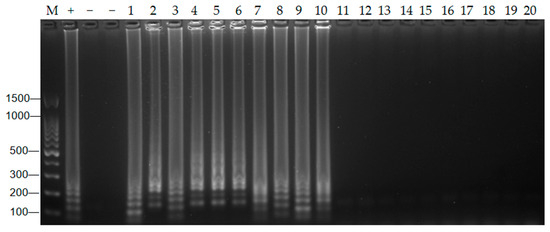 The LAMP reaction was analyzed by 2% AGE in order to obtain the optimal LAMP amplification system (Figure 1). Considering the brightness of the amplification product on the gel, the cost of the reagent, and other factors, the optimal LAMP system consists of Bst DNA polymerase at concentrations of 0.48 U/μL, 0.32 U/μL, and 0.32 U/μL. The final concentration of Mg2+ is 8 mM, 8 mM, and 6 mM. The dNTP mix concentration is 1.6 mM, 1.8 mM, and 1.4 mM. The internal and external primer addition amounts are 4.0 μL:0.25 μL, 4.0 μL:0.5 μL, and 3.0 μL:0.5 μL. The reaction temperatures tested were 62 °C, 61 °C, and 61 °C. The concentrations of each loop primer are 0.25 mM, 0.50 mM, and 0.50 mM, and the reaction time is 30 min, 30 min, and 35 min.