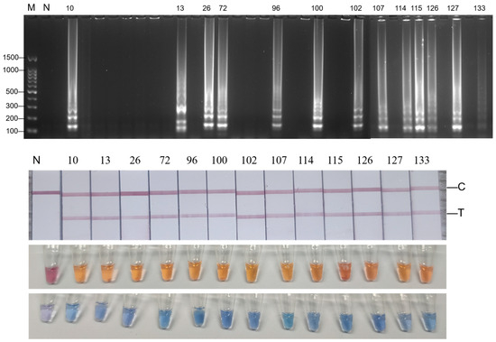 The results showed that all three methods detected positive samples, and the number of positive samples detected was consistent with the corresponding number, maintaining a high degree of accuracy. Among the 155 bivalve shellfish aquatic products, a total of 13 samples showed positive results, and the other samples were negative. The positive samples were numbered 10, 13, 26, 72, 96, 100, 102, 107, 114, 115, 126, 127, and 133 (Figure 8). The positive sample detection rate of the statistical visual LAMP method was 8.39%.