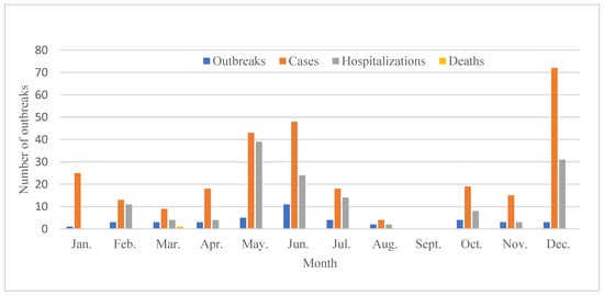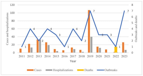 | Year | Outbreaks | Cases | Hospitalizations | Hospitalizations/Cases | Deaths | |||