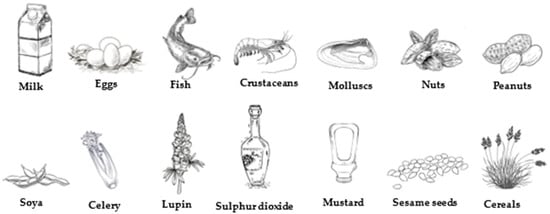 At the European level, the Annex II of Regulation 1169/2011 on the provision of food information to consumers [12] lists the 14 substances that must be compulsorily declared on food labels (Figure 1). This regulation also establishes the content and presentation of other mandatory mentions and also requires that all of them be presented in a prominent place, in such a way as to be easily visible, clearly legible, and, if necessary, indelible. Thus, when it comes to the labeling of certain substances or products that cause food allergies or intolerances, it specifies that they must be included in the ingredients list and must be highlighted using a typographic composition that clearly differentiates them from the rest of the ingredients. In the absence of an ingredient list, the word “contains” must be included followed by the name of the substance.