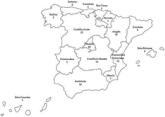 Figure 2 details the origin of the answers received. Predominantly, the participation came from certain regions, mostly in Madrid (n = 49), followed by Comunidad Valenciana (n = 12), Castilla la Mancha (n = 12), and Castilla y León (n = 12).