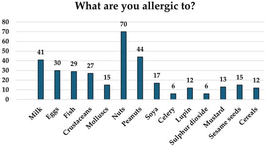 The second block consisted of 6 questions to characterize the sample socio-demographically (age, gender, place of residence, age of allergy diagnosis) and main allergies, as well as three dichotomous questions (yes/no) related to dietary and nutritional aspects (whether the sample has a healthy and balanced diet, nutritional deficiencies, or whether it is easy to replace foods that cannot be consumed).
