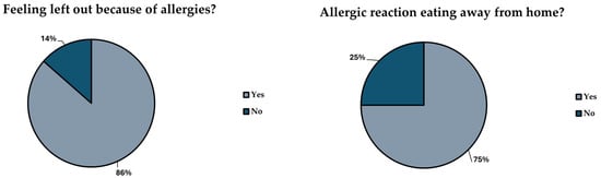 The answers obtained from the questionnaire showed that in all variables asked, there was higher worry, discomfort, or even, on occasions, fear associated with everyday activities, which affected their social relationships as well. Living with allergies imposes restrictions on daily life, as any food-related activity can pose a risk. Many activities involve food forces, in many occasions, to turn down plans and social events, which can lead to a feeling of isolation or exclusion [9,17,33]. According to the results of the survey, women tend to feel more excluded than men. The results match with the significant differences found in the revision made by Rosser [29] who also pointed out that women tended to have more anxiety and fear of allergic reactions; however, the results could be altered depending on the kind of food that caused the allergy [28]. More studies focused on the effect of gender are required.