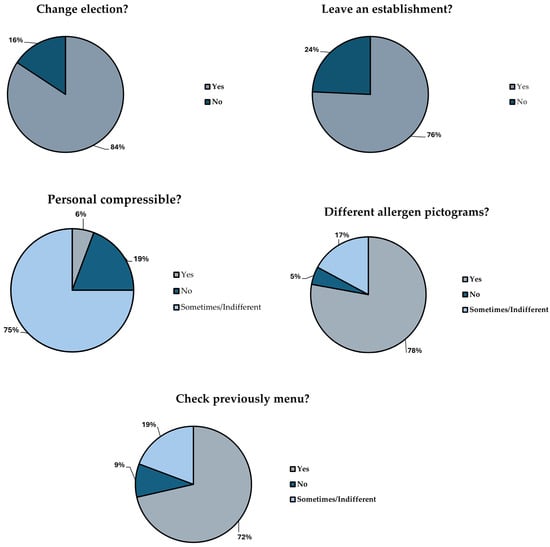 Despite the above, people with food allergies usually ask and confirm that the preparation of the dish is suitable for them, employing verbal communication with the person who serves them, which is essential to ensure safety since the food is prepared in a different way than the one prepared at home [40,44]. This sometimes leads, as shown by the answers of the questionnaire, to them changing their food choice because although the allergens on the menu indicated that it was safe, the staff may have indicated otherwise.