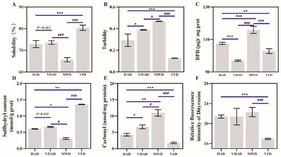 Effects of different drying methods on (A) solubility, (B) turbidity, (C) surface hydrophobic properties, (D) sulfhydryl content, (E) carbonyl content, and (F) dityrosine of scallop Patinopecten yessoensis. Abbreviation: HAD, hot air drying group; VHAD, vacuum hot air drying group; MWD, microwave drying group; VFD, vacuum freeze-drying group. The significant difference at p < 0.05 determined by ANOVA (Duncan’s test). * p or # p < 0.05. ** p < 0.01, *** p or ### p < 0.001 represent significant difference compared to groups determined by Student’s t-test.
