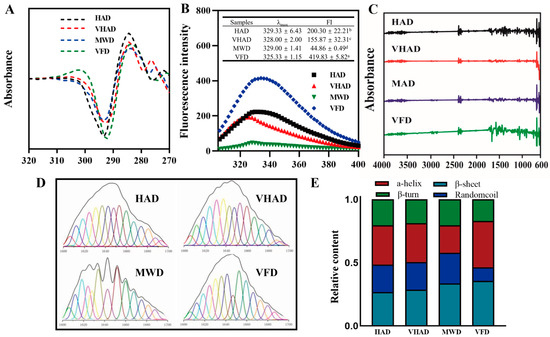 Dityrosine’s relative fluorescence intensity is the numerical value of the fluorescence signal intensity produced by dityrosine [47]. After undergoing VFD treatment, the dityrosine content decreased to 16.8%. It was illustrated that the relative fluorescence intensity of VFD was significantly lower than HAD, VHAD, and MWD (p < 0.001). The fluorescence intensity of tryptophan residues expresses the tertiary structure of proteins [40]. As shown in Figure 3, VFD exhibits the highest fluorescence intensity at 325.3 nm, with an intensity of 419.8. HAD, VHAD, and MWD showed sequentially decreased fluorescence intensities. The maximum emission wavelengths for MP after HAD, VHAD, and MWD are 329 nm, 328 nm, and 329 nm, respectively, while VFD is 325 nm, indicating a red shift compared to the other drying methods. This suggested that drying alters the microenvironmental conformation of MP. The drying treatment could change a protein’s structure, affecting its fluorescence properties [9]. In contrast, low-temperature freezing helps preserve the original structure of proteins, thereby maintaining their fluorescence intensity.