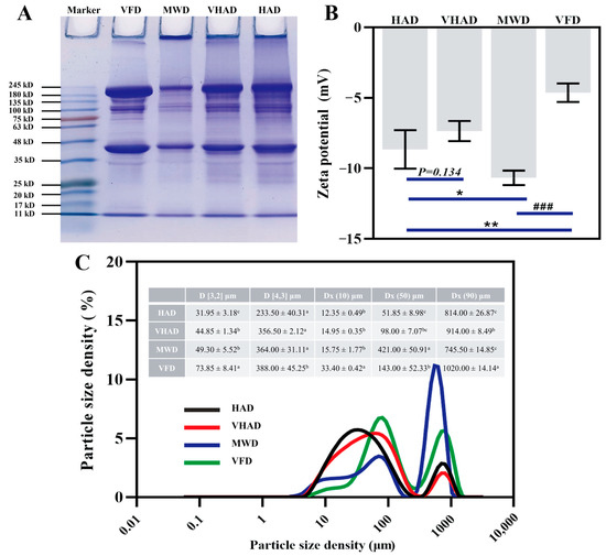 Effects of different drying methods on (A) protein molecular weight, (B) zeta potential, and (C) particle size distribution of scallop Patinopecten yessoensis myofibrillar protein. Abbreviation: HAD, hot air drying group; VHAD, vacuum hot air drying group; MWD, microwave drying group; VFD, vacuum freeze-drying group. The significant difference at p < 0.05 determined by ANOVA (Duncan’s test). * p < 0.05. ** p < 0.01, ### p < 0.001 represent significant difference compared to groups determined by Student’s t-test. a,b,c Means in the same column with different superscripts differ significantly (p < 0.05).