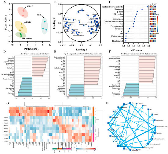 Structural and oxidation properties of scallop (Patinopecten yessoensis) adductor muscle. (A) Principal component analysis; (B) Loading plot; (C) VIP value; (D) Top 25 compounds correlated with the Aw; (E) Top 25 compounds correlated with the Rehydration ratio; (F) Top 25 compounds correlated with the Recovery ratio; (G) Correlation heat map; and (H) Spatial network correlation. (Abbreviation: HAD, hot air drying group; VHAD, vacuum hot air drying group; MWD, microwave drying group; VFD, vacuum freeze-drying group; glycine, Gly; arginine, Arg; leucine, Leu; valine, Val; alanine, Ala; serine, Ser; proline, Pro; isoleucine, Ile; phenylalanine, Phe; lysine, Lys; threonine, Thr; methionine, Met; histidine, His; tyrosine acid, Tyr; aspartic acid, Asp; cysteine, Cys; glutamic acid, Glu).