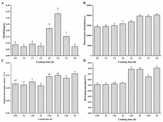 Figure 1B exhibited that the fluorescence intensity at the maximum absorption wavelength of 414 nm showed a gradually increasing trend, and the change was significant after 1.5 h of cooking (p < 0.05). Veberg et al. [16] added aldehydes to minced meat in their experiment, and the maximum absorption peak was observed at 410–550 nm, which suggested that the fluorescent pigments may be produced by the reaction of unsaturated aldehydes with proteins. It can be found that after cooking for 3 h, the fluorescence intensity remained at a relatively high level. As seen in Figure 1C, the content of the intermediate products of the Maillard reaction fluctuated during the first two hours of cooking, then increased significantly and remained essentially unchanged. Maillard intermediates were formed and simultaneously consumed during the heating process. This complex phenomenon may be related to the formation and degradation of sugar, Strecker degradation, and additional involvement of the carbonyl ammonium reaction during the Maillard reaction [28]. The dynamic reaction caused variations in the content of Maillard intermediates. Figure 1D showed that the browning degree displayed a continuous upward trend and increased significantly after 2 h of cooking, which may be attributed to the prolonged heating that promoted the process of the Maillard reaction and the accumulation of brownish substances.