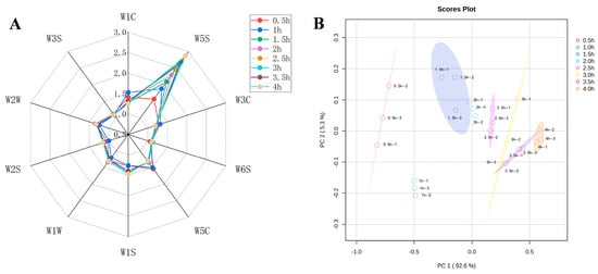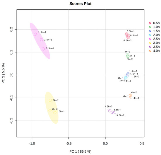 One-way analysis of variance (ANOVA) and Waller–Duncan homogeneity tests were conducted using SPSS Statistics 23.0 software to assess the significant differences between samples from different sampling times (p < 0.05). Principal component analysis (PCA) and partial least squares discriminant analysis (PLS-DA) were performed using MetaboAnalyst 6.0. The determinations of samples from different sampling times were performed in three parallel groups, and the data results were presented as the mean ± standard deviation.