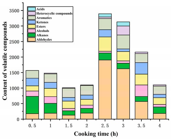 GC-MS was employed to determine the volatile flavor compounds during the cooking process of sheep bone soup. As seen in Table 3, 39 flavor compounds were identified, including 4 aldehydes, 3 ketones, 7 alcohols, 7 esters, 1 acid, 5 aromatics, 8 alkanes, and 4 heterocyclic compounds. The total content of volatile flavor compounds exhibited a fluctuating tendency, initially decreasing and subsequently increasing during the early and middle phases of cooking, attaining the peak after 2.5 h of cooking, and then decreasing continuously as the cooking time was prolonged (Figure 3), which was similar to the changes in flavor compounds reported by Meng et al. [3] in bovine soup within 6 h of stewing. Volatile flavor compounds, including aldehydes, alcohols, esters, and ketones, are mainly produced by the oxidative degradation of lipids, but continuous heating may result in loss due to their volatile properties and interactions between components; these effects determine the variation in the content of volatile aromatic compounds [6].