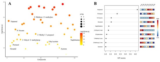 Multivariate statistical analysis results (A), ANOVA plot (B), variable importance projection of PLS-DA analysis (top 10 flavor substances with large VIP values).