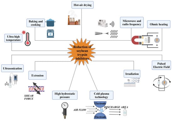 Radio frequency (RF) refers to electromagnetic waves with frequencies ranging from 1 to 300 MHz. The sample is heated by converting electromagnetic energy into thermal energy through collisions with ions, molecules, and friction created by the heat [100]. It has faster heating rates and greater penetration capabilities compared with the conventional thermal methods [101]. Research [102] reported that RF treatment can generate better digestibility of proteins and lower activity of STIs (≥100 °C) at higher temperature, short time, and low frequency. The content of ANFs, e.g., STIs, tannins, saponins, and phytic acid in soybeans, could decrease after being treated with RF at 6 kW for 30 min [38]. The activities of STIs may be reduced significantly by about 95.2% after RF treatment at 27.12 MHz. The thermal effects of RF are responsible for the inactivation of STIs due to the changes in structure [103].
