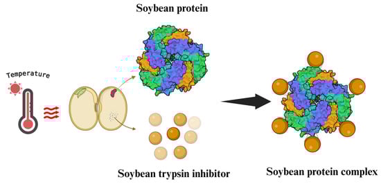 Though soybean has nutritional characteristics, it also contains many anti-nutritional bioactive substances (Table S1) that have negative effects on the metabolic and physiological activities of human including Lipoxygenase (LOX), urease, Soybean Trypsin Inhibitors (STIs), Soybean agglutinin (SBA), Tannic acid, Phytic acid, Urease, Saponin, and Isoflavones. Most of the antinutritional factors (ANFs) are derived from whey soy protein, which included STIs in the 2S component and SBA, LOX classified as 7S [11,12]. These antinutritional factors can restrict the digestion and absorption of certain nutrients. As an illustration, the over-secreted mucus stimulated by SBA can affect the enzymatic reactions and absorptive capacity of the intestinal wall [4]. The lipoxygenase enzyme can catalyze the oxidation of polyunsaturated fatty acids, like linoleic and linolenic acid, resulting in unpleasant flavor [13,14]. STIs form complexes with trypsin/serine proteases to inhibit their activity and are widely found in animals, plants, and microbes [15]. In some commercial soybean products, urease activity (by the American Oil Chemists’ Society (AOCS) official method) can be indirectly used to assess the inactivation of STIs. The two main STIs—Kunitz trypsin inhibitor (KTI) and Bowman–Birk inhibitor (BBI)—draw attention due to their 10% share in seed protein and significant impact on digestion (Figure 1) [16]. Studies show that STIs in soybean products can exceed 30 mg/g, leading to much lower digestibility of soybean protein (66.1%) than that of whey protein (75.5%) [17]. While other ANFs in soybeans affect nutrient absorption in humans, their impact is less significant and widespread compared to STIs. This study focuses on STIs, particularly KTI and BBI, emphasizing their method and mechanism of inactivation.