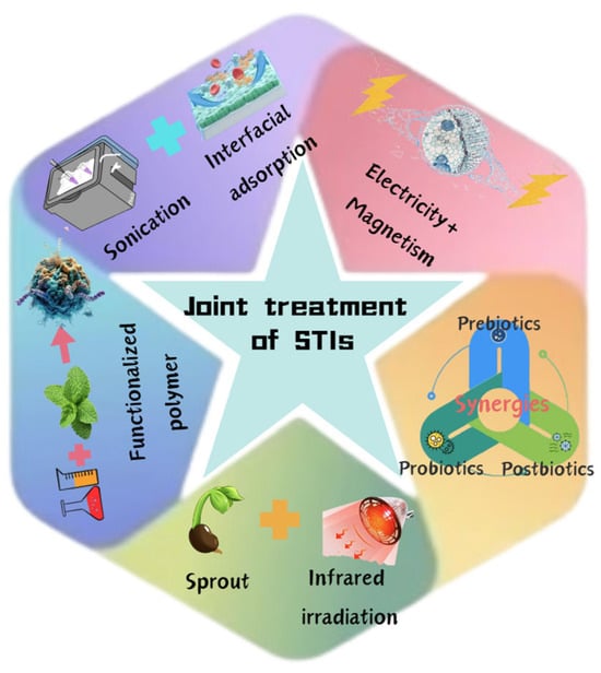 More methods will be discovered for STIs inactivation in the future. For thermal processing, researchers can use immunofluorescence to observe the ultrastructural distribution of STIs and soybean proteins. They can also use immunoprecipitation and crosslinking mass spectrometry to study the proteomics of STIs and soybean protein fractions interactions (7 s, 11 s). At the molecular level, molecular docking, computational modeling, and spectroscopic analysis will be used to analyze the active site changes of TIA and CIA and explore the dynamics of amino acids and disulfide bonds. The safety assessment of products is worth exploring. In vitro digestion experiments, mouse experiments, and epidemiological investigations are trusted validation methods. Additionally, research will be focused on developing combined processing techniques, including the synthesis of specific functional polymers, combination of thermal and non-thermal treatments, and complex action of multiple proteases to improve STIs inactivation efficiency (Figure 5). Balancing the reduction in substances that are not good for nutrition and increasing the nutrients that are good for health is a difficult task. This will be a key point of research.