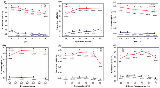 Effects of extraction conditions on extraction yield of flavonoids and alkaloids from ML. Different letters of a–d indicate a significant difference (p < 0.05). (A) represents the effect of pH on the extraction yield; (B) represents the influence of the ratio of liquid-solid on the yield; (C) represents the influence of time on extraction yield; (D) represents the influence of extraction times on extraction yield; (E) represents the influence of temperature on yield; (F) represents the effect of ethanol concentration on the yield.
